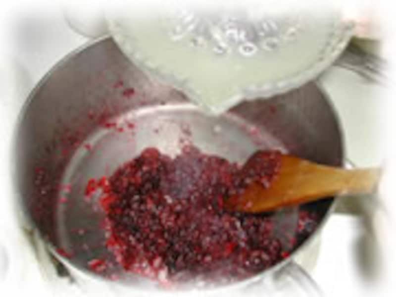 | 2・水切りしたクランベリーは細かく切っておきます。 | 3・砂糖、白ワインを加え、中火から弱火で20分間ほど煮つめ、レモン汁を加えます。冷めたらでき上がりです。 | |