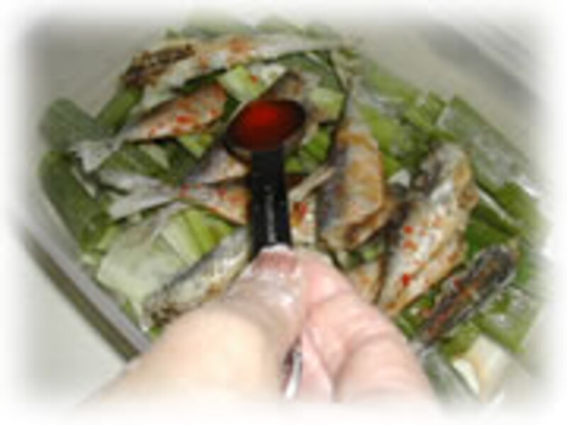 | ☆豆アジは綺麗に洗い、手で頭からハラワタを切り取ります。 アジ、ネマガリタケをかたくり粉をまぶして油で揚げます。玉ネギスライスなどの上に揚げたてを並べ、すぐにタレをかけ、味をしみ込ませます。 |