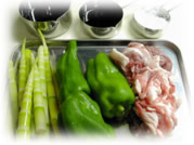 | 2・ピーマンは細きり、ネマガリタケは食べやすい長さに切っておきます。 中華鍋にサラダ油を熱し、ネマガリタケ、ピーマンを強火で手早く炒めて、豚肉を加え合わせ調味料を回し入れ、手早く味をからめます。 |