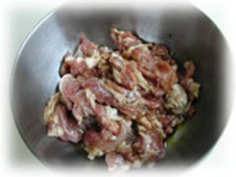 1・豚肉は細かく切り、豚肉用調味料で下味をつけておきます。