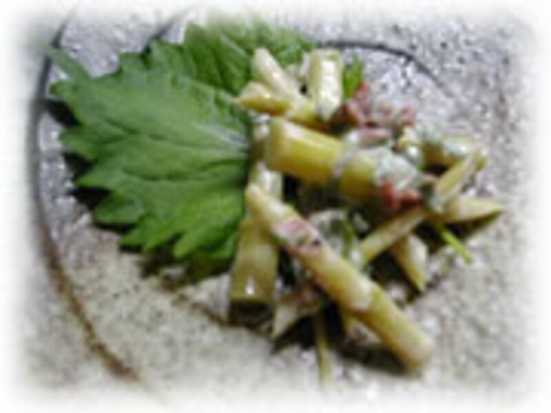 | ネマガリタケを、ダシと酒で薄味に煮てから、梅干しと青ジソのみじん切りをマヨネーズで和えます。 ネマガリタケの歯ごたえと、梅マヨネーズのさっぱりとした味がとてもマッチする一品です。 |