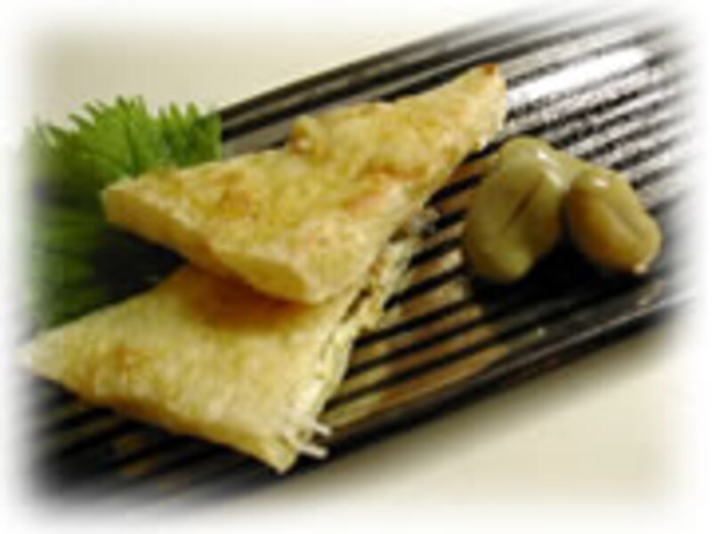 ネマガリタケ、ネギ、ミヨウガを千切りにして、半分に切った油揚げに詰め、薄く焦げ目が付くように焼きます。おろし大根と醤油でいただきます。 空豆の酢漬け:茹でた空豆を和風ドレッシングに漬け込み冷やしておきます。 |