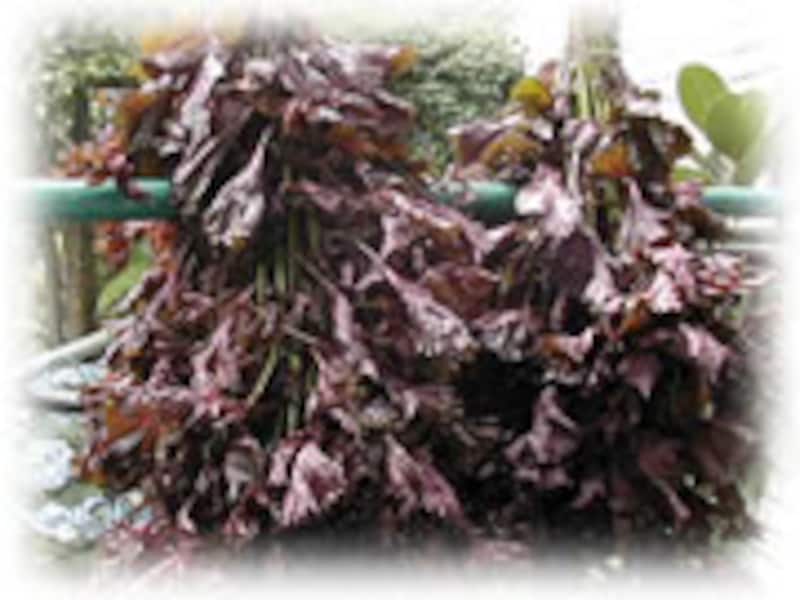 | ☆赤ジソは茎ごとたっぷりの水で良く洗い、竿などにかけて水気を切っておきます。水切りを終えたら葉だけを摘み取って使います。 | 材料:シソの葉400g、三温糖1Kg、米酢500cc、水2リットル。 | |