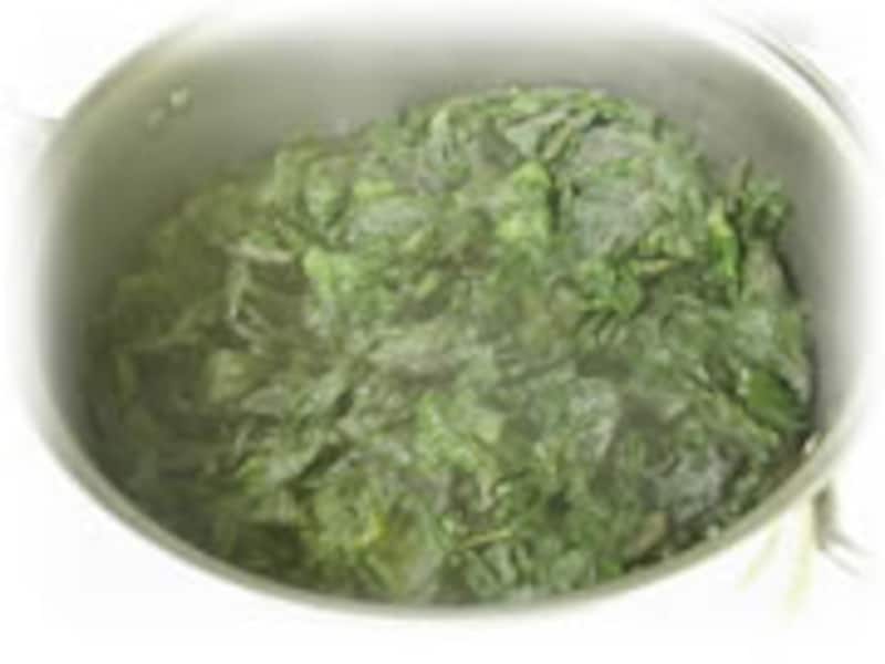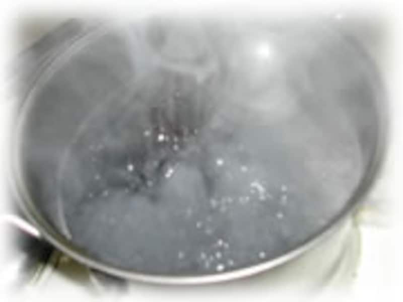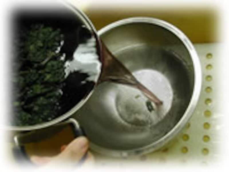 | 1.大鍋に水2リットルを入れ沸騰してから、シソの葉を加えて中火で5~6分煮ます。赤い色素が湯に溶け込み赤ジソの葉が緑色に変わります。 | 2.ボールにざるで煮汁を濾します。 残ったシソの葉は細かくきざみ、醤油とみりんで煮て、山椒やチリメンを加えた佃煮にすると常備菜になります。 |