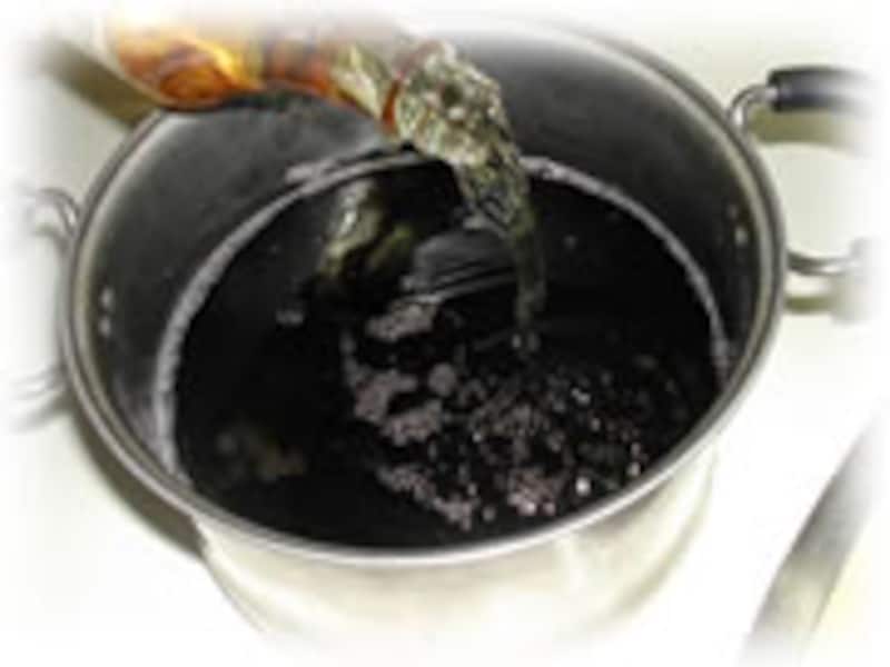 | 3.濾した煮汁を再び中火にかけ砂糖を加えます。良くかき混ぜて砂糖を溶かします。火を止めます。 | 4.充分に冷めてから、米酢を加え、良くかき混ぜます。 | |