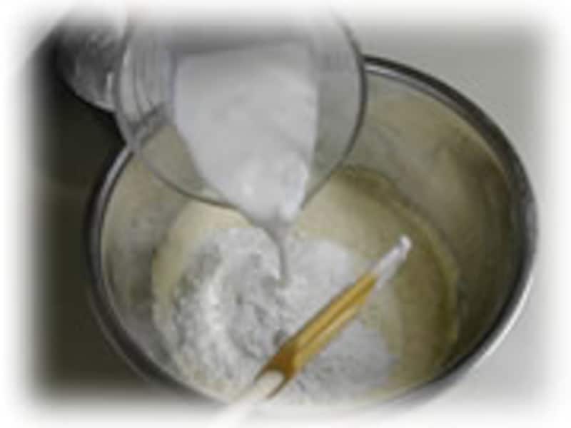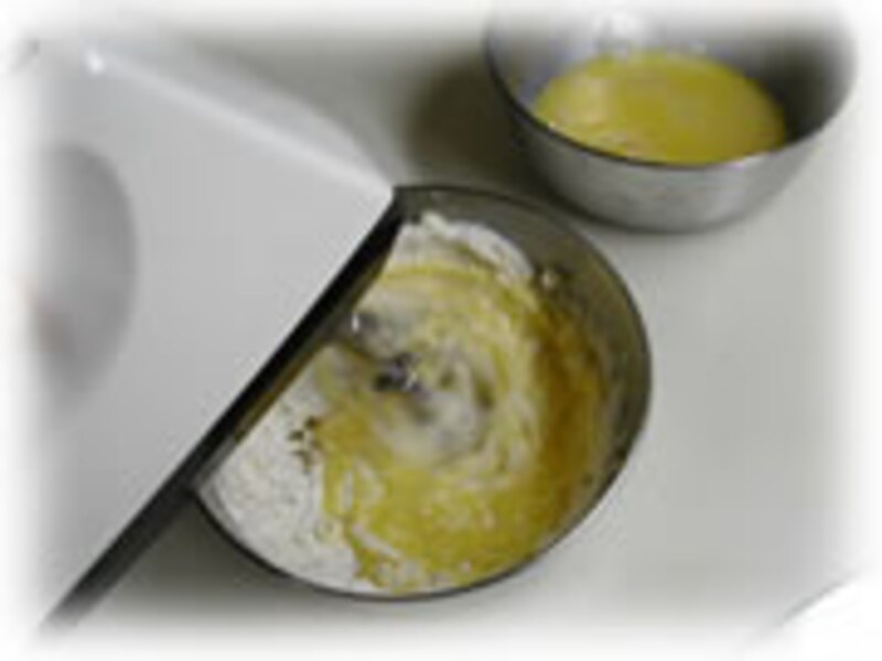 | 2・溶きほぐした卵を少しずつ加えて良く馴染ませます。 | 3・ふるった粉と牛乳を2回くらいに分けて加えていきます。 | |||||||