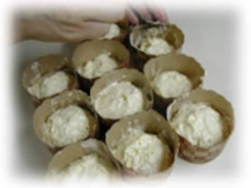 | 4・ゴムベラで切るように、さっくりと良く混ぜ合わせます。 | 5・型に生地のまん中がこんもり高くなるように7分目まで入れます。 | |||||||