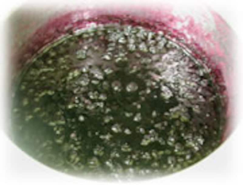 | 2・鍋を火にかけ白ワインを加え、中火でアクを取りのぞきながら煮ます。とろみが付けば、でき上がりです。 | プリザーブスタイルのブルーベリージャムは色鮮やかなフルーツソースもお楽しみいただけます♪ ツブツブのないジャムは、鍋にブルーベリーを入れ、指先やヘラでよく潰してから砂糖をまぶし、5時間ほど置いてから煮ます。 |
