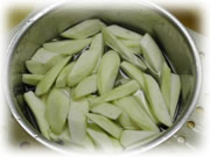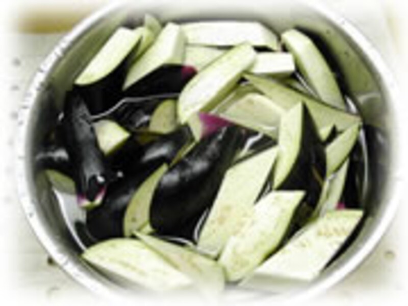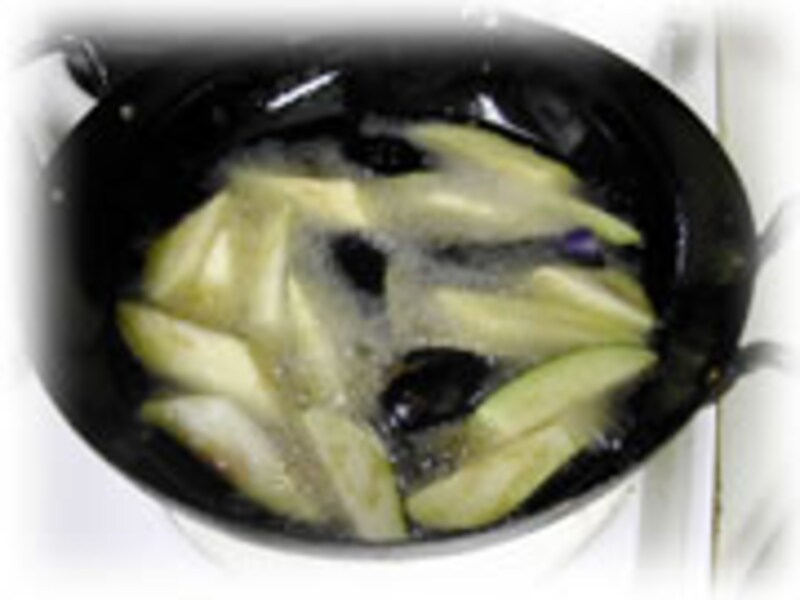 | 2・水気を切ったナスを、中温に熱した油でさっと揚げ、白ワインに漬け込んでおきます。 漬け込んだナスが冷えたら、塩コショウで味をととのえ冷蔵庫で冷やします。 |