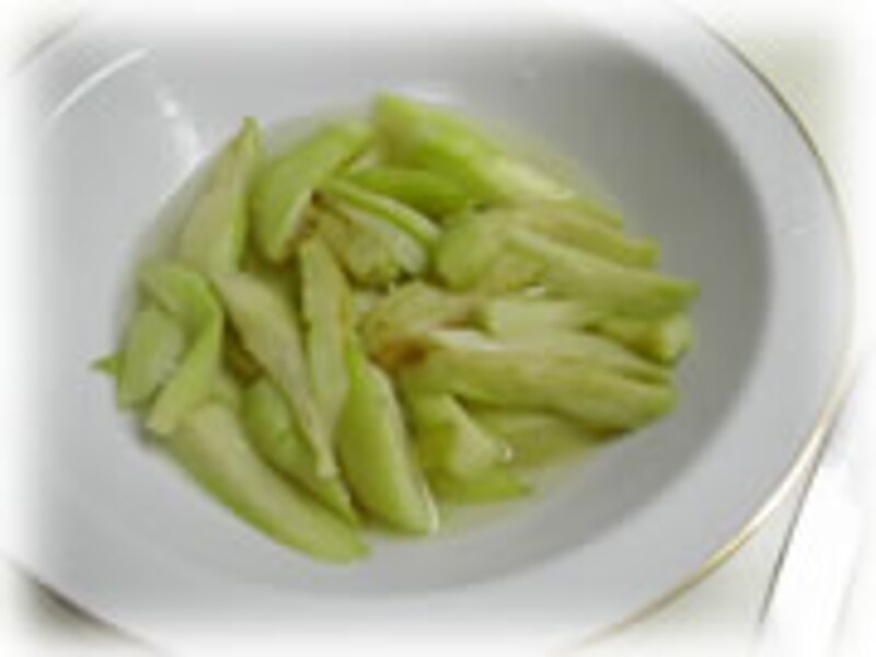 | 2人分材料:なす3~4個、白ワイン100cc、塩コショウ少々、イタリアンパセリ少々。 | 1・ナスは皮をむき、乱切りにして、塩水に浸けておきます。 | |