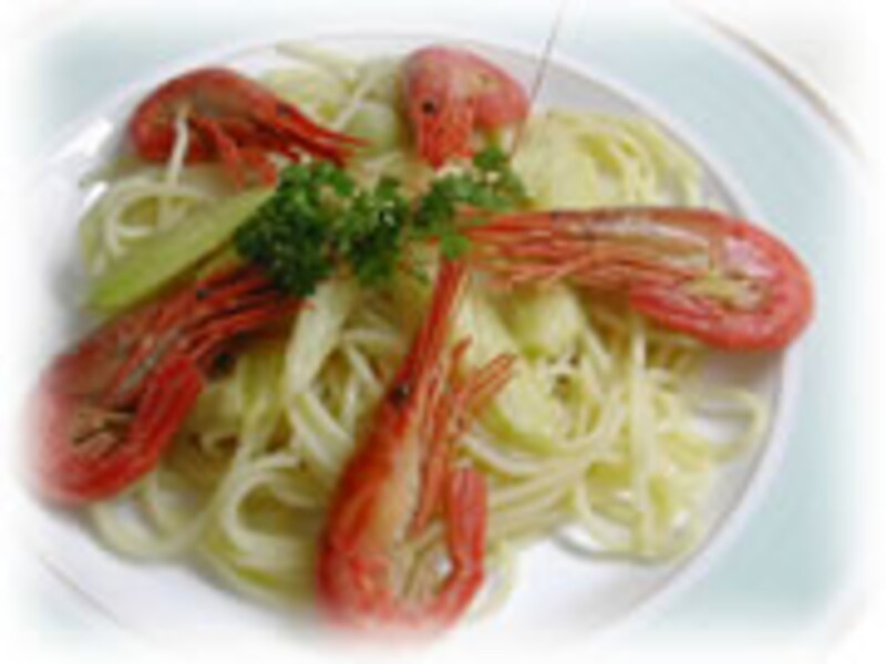 イタリアンパセリのみじん切りを振りかけ、冷たいオードブルとしてお召しあがり下さい 。 またパスタを柔らかめに茹で、氷水にさらして充分に冷まし、オリーブオイル大サジ2、レモン汁1/4個、塩コショウを混ぜ合わせパスタと和えます。揚げナスのワイン漬け、ゆでた海老を飾付け、チーズを振りかけて、簡単ワンプレートレシピとしてもお楽しみいただけます。 |