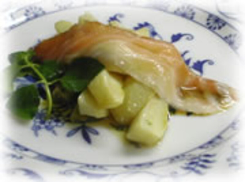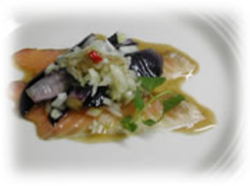 | 2・ドレッシングの材料を混ぜ合わせ、揚げたナスを漬けていきます。 | 3・スモークサーモンに揚げナスのマリネ、みじん切りの玉ネギを飾り香草を添えたオードブルはいかがでしょうか。 | |