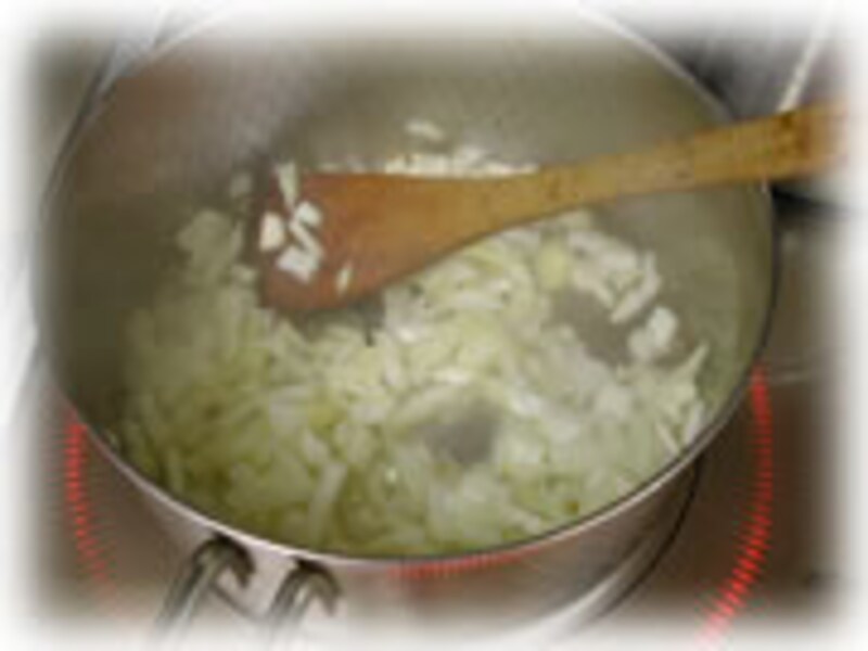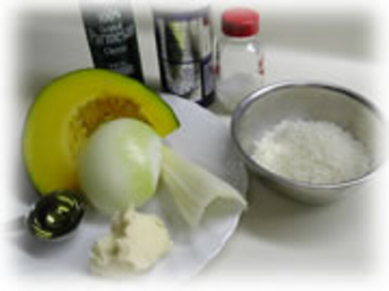 材料2人分:カボチャ100g、米100g、玉ネギ1/2個、セロリ約10cm、バター20g、オリーブオイル小サジ2、お湯450cc、スープの素1個、パルメザンチーズ20g、塩コショウ少々。 |