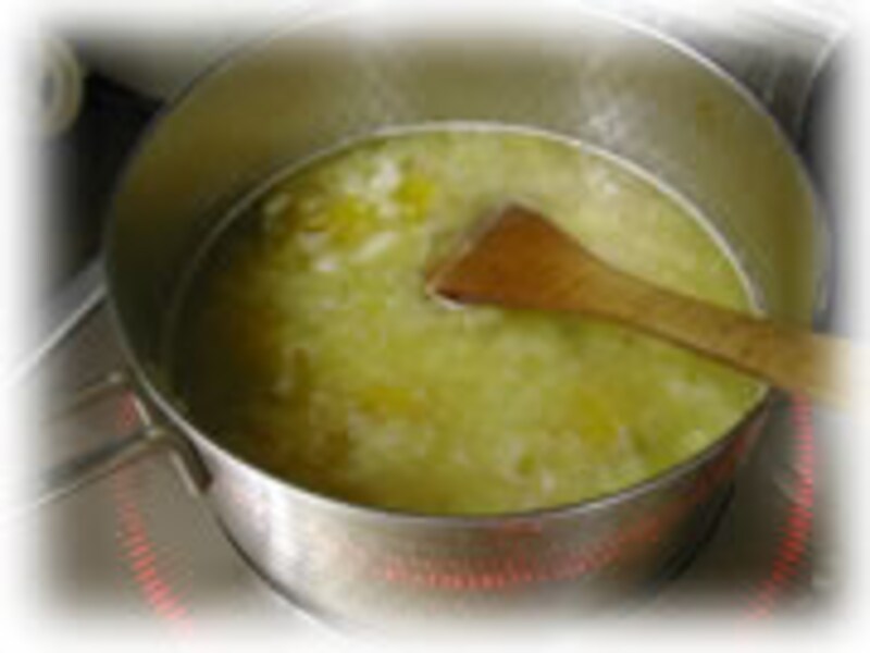 | 2・お米を入れてさらに良く炒めます。 | 3・熱いお湯で溶かしたスープを半分、カボチャも2/3くらい加え、良くかき混ぜます。 | |