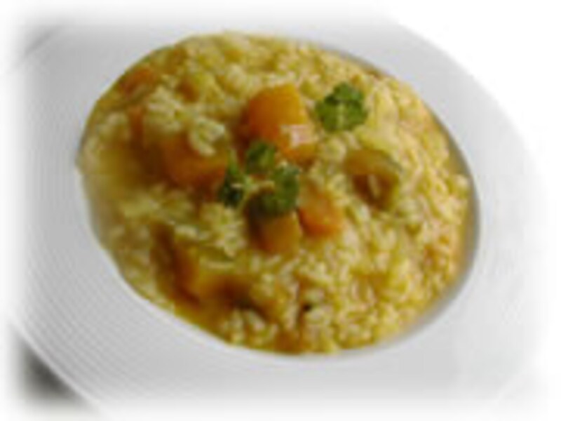 材料2人分:カボチャ100g、米100g、玉ネギ1/2個、セロリ約10cm、バター20g、オリーブオイル小サジ2、お湯450cc、スープの素1個、パルメザンチーズ20g、塩コショウ少々。 |