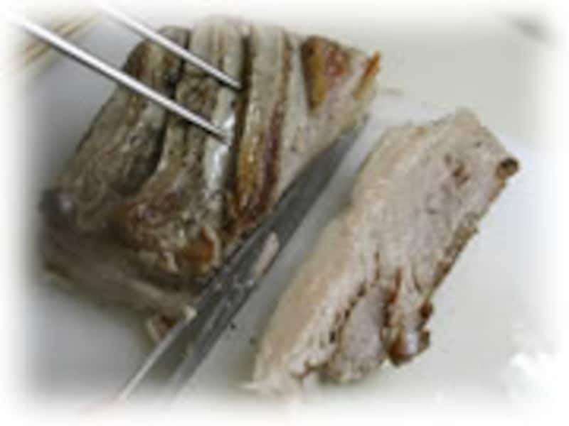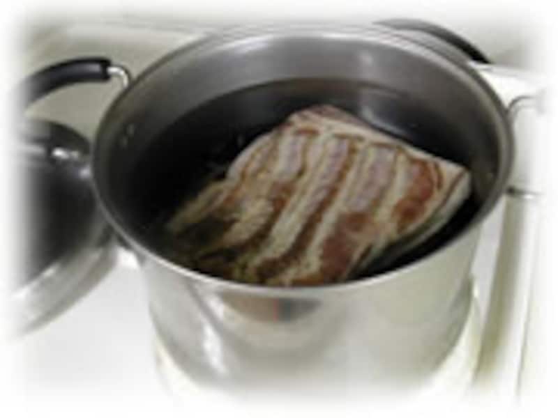 | 3・鍋にたっぷりの水を入れ強火で豚肉を煮ます。煮立ってアクが出てきたらていねいに取り去り、弱火でコトコトと3時間くらい煮ます。火を止め冷めるまで、そのままにしておきます。 | 4・ちょっと時間はかかりますが、これだけで、でき上がりです。取りだして良く冷ましてから、お好みの厚さにスライスしてお使いください。 | |