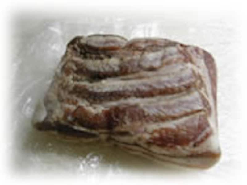 | 材料:豚バラ肉約1kg、塩大サジ2~3。 1・豚肉に塩を良くすり込み、脱水シートに包み1週間ほど冷蔵庫でねかせておきます。 |