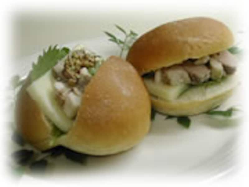 | ☆大葉、白髪ネギ、練り梅にほんの少しダシ醤油をかけた和風のお総菜はいかがでしょうか。 | ☆テーブルパンに、スーチキー・大葉・ピクルス・チーズなどお好みを挟んだサンドイッチも手軽なランチやブランチにも良いですね。 | |