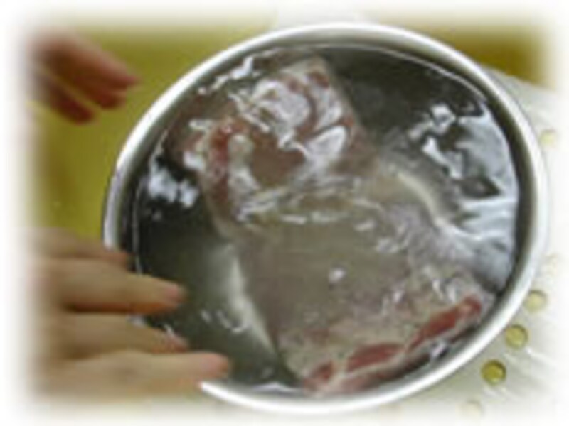 2・ボールに水を張り、時々水を変えながら2時間ほど塩漬け肉から塩気を抜きます。 | |