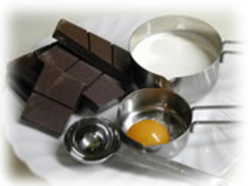 | 材料:チョコレート150g、生クリー100cc、卵黄1個、クワントロ大さじ1。 | 1・ボールに卵黄を入れ良く溶きほぐし、人肌に温めた生クリームを少しずつ加え、良く混ぜ合わせます。 | |