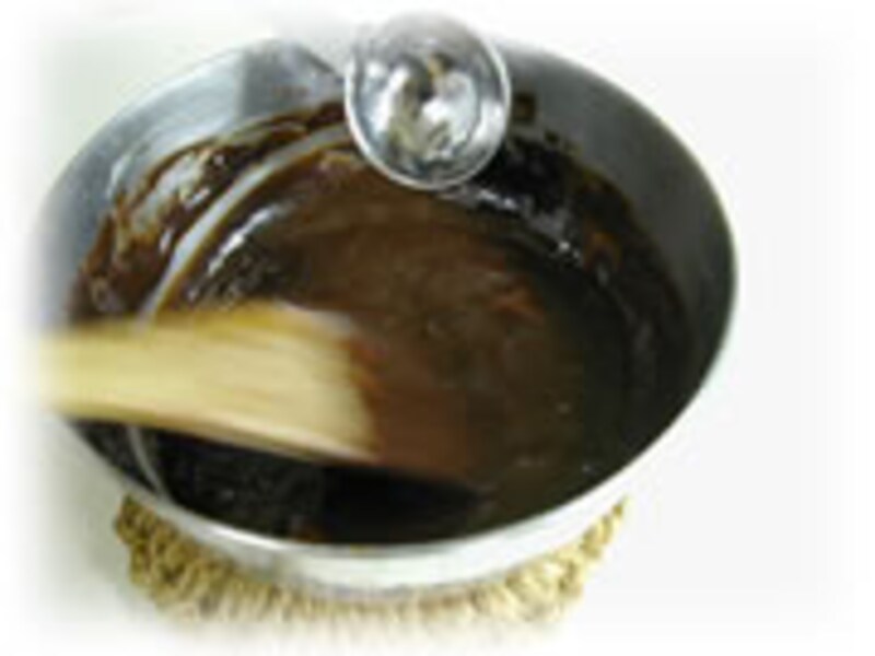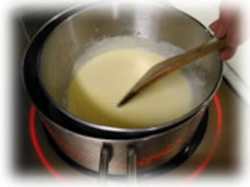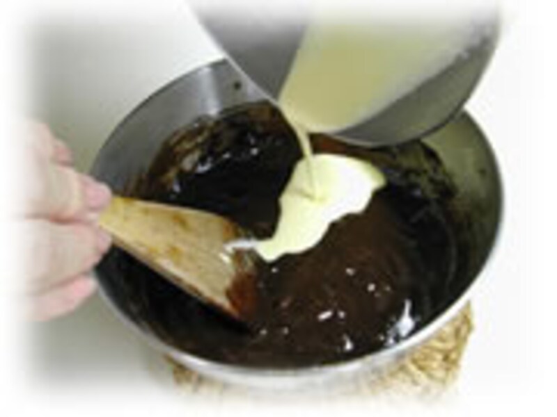 | 2・80度位のお湯で湯煎にかけながら、トロミがつくように3~4分間かき混ぜながら煮ます。 | 3・細かく刻んだチョコレートに暖かいクリームを4~5回に分けて加え、チョコレートが均一に溶けるように混ぜ合わせます。 | |