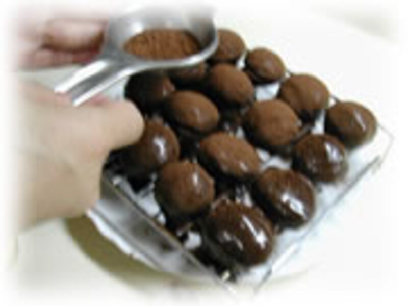 7・乾いて固まってきたら、細かい目の茶漉しを使ってココアパウダーを振りかけます。 | |
