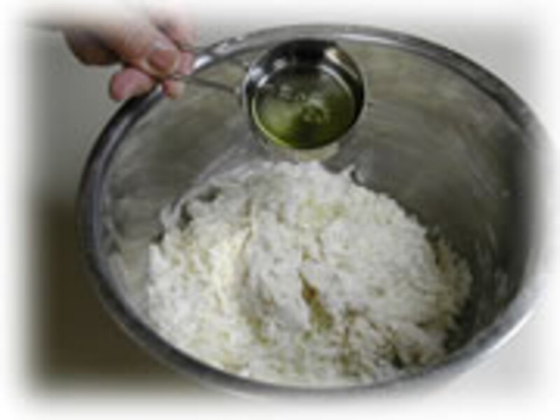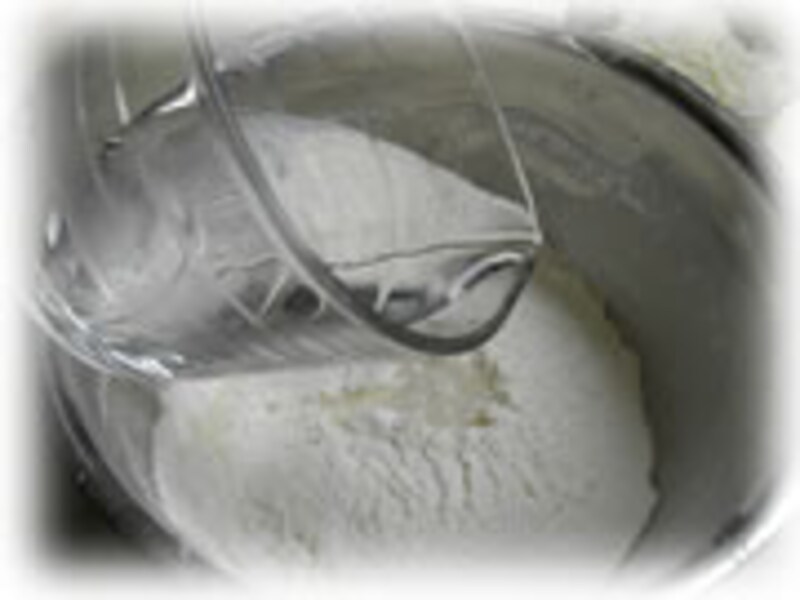 | 1・ボールに振るいあわせた200gの粉、塩、砂糖を入れ中央にくぼみを作り、ドライイーストを入れます。ぬるま湯を加え手で混ぜ合わせます。 | 2・この段階でチーズ50g、オリーブオイル大さじ1を加えます。 | |||||||||||||||||||