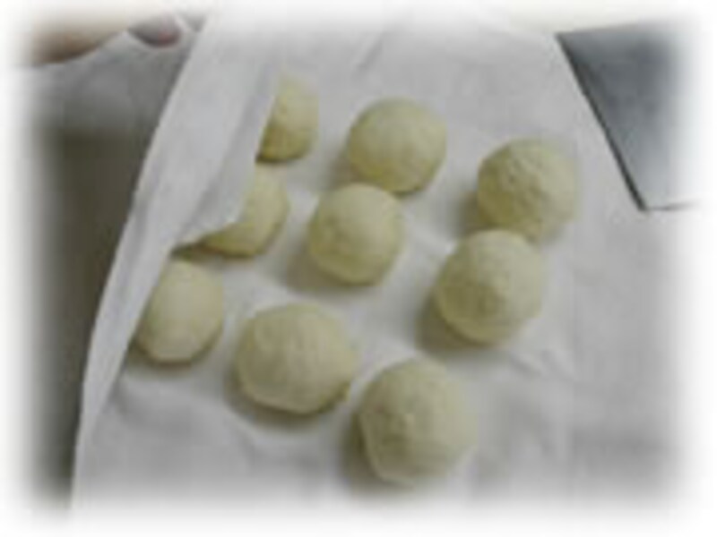 | 5・一次発酵が終わりました。生地が約2倍の大きさに膨らんでいます。 | 6・キャンバス地に生地を移し16等分に切り分け、一つずつ切り口を下に巻き込むようにしてガス抜きをして丸め、布をかぶせて15分間ベンチタイムをします。 | |||||||||||||||||||