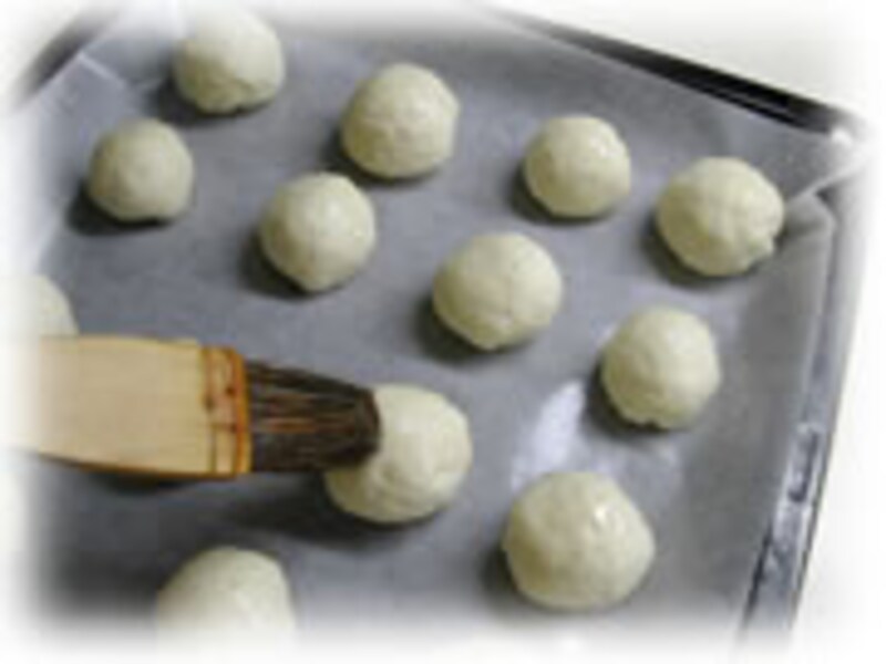 | 7・天板に丸く成形した生地を並べ、サランラップを軽くかけ30℃で15分間二次発酵をします。二次発酵が終われば、残りのオリーブオイル大さじ1を刷毛で生地の表面に塗ります。 | 8・180℃に予熱したオーブンで、約15分こんがり焼き色がつくまで焼きます。 | |||||||||||||||||||