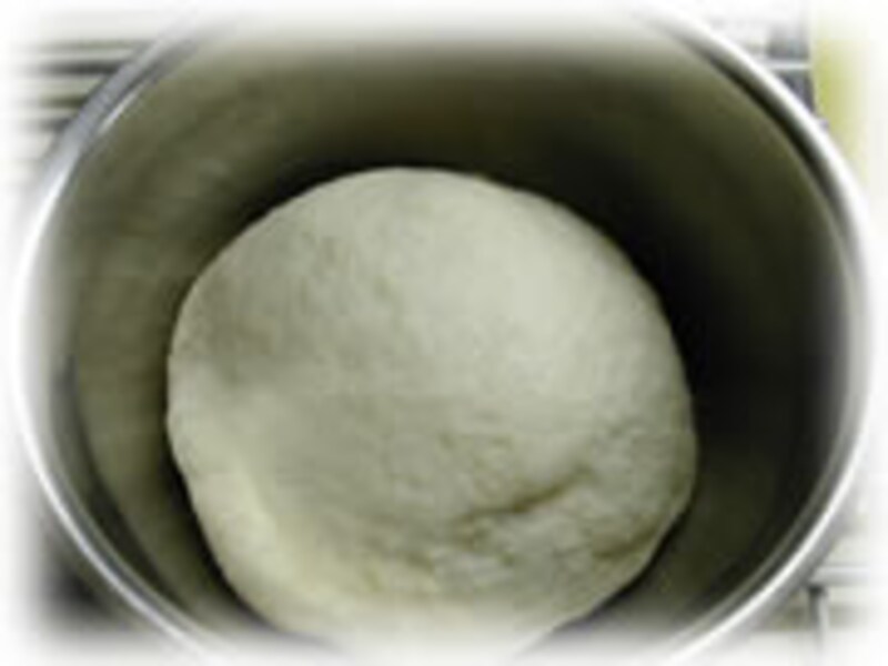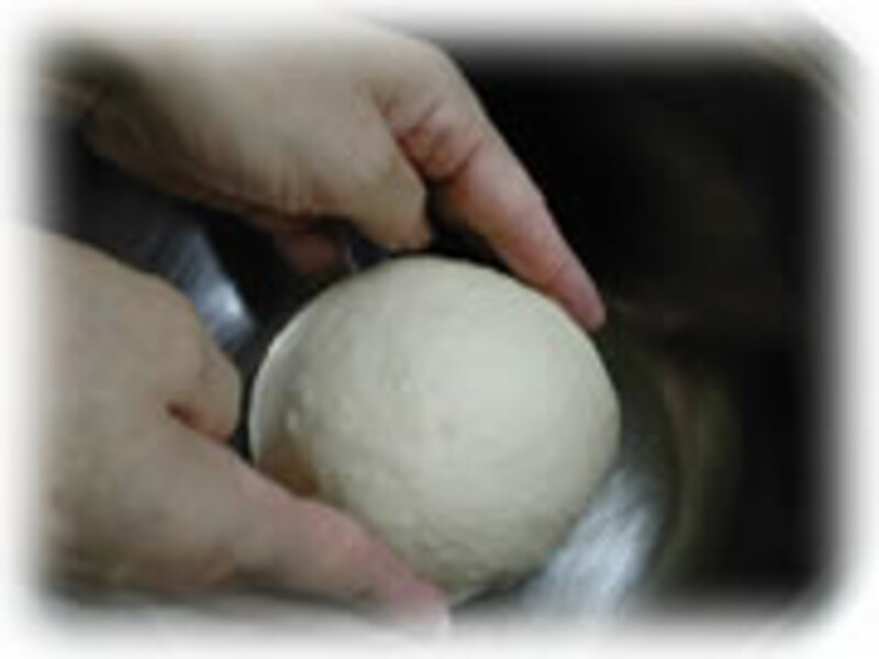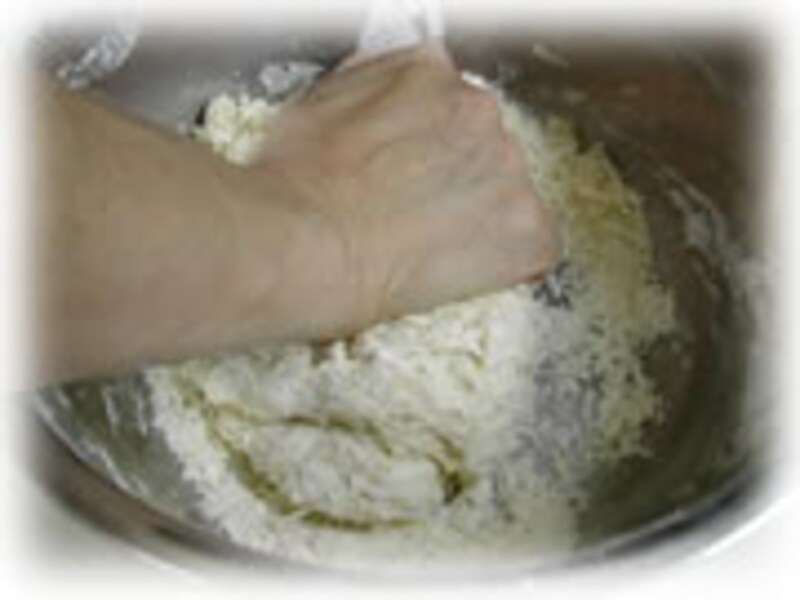 | 3・チーズを加えると、なかなかまとまりにくいのですが、根気よく手で捏ねます。生地をこね台にうつして10分程生地を良く捏ねます。 | 4・うすく油をひいたボールに生地をおき、ラップをかぶせ30℃で、1時間ほど一次発酵をします。 | |||||||||||||||||||