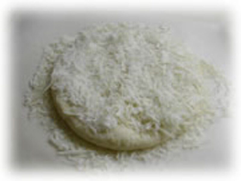 6・クッキングシートの上に10gのチースを敷き生地をおき、上に残り10gのチーズをかけます。 |