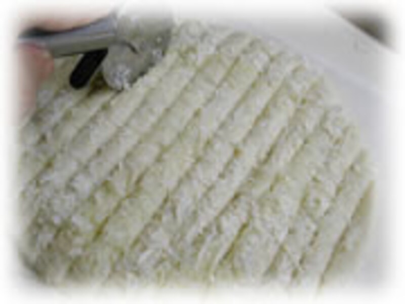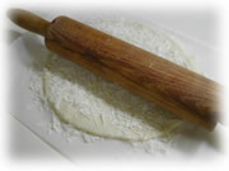 | 7・麺棒で押さえるようにして生地の厚みが1cm位になるように広げます。 | 8・パイカッターで約1cm巾に切ります。 | |||||||||||||