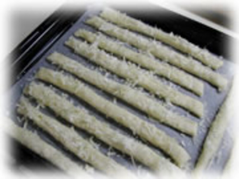| 9・天板にクッキングシートを敷き、生地を1本ずつ並べます。 | 10・200度に予熱しておいたオーブンで約20分焼きます。香ばしいチーズたっぷりのグリッシーニの焼き上がりです。 | |||||||||||||