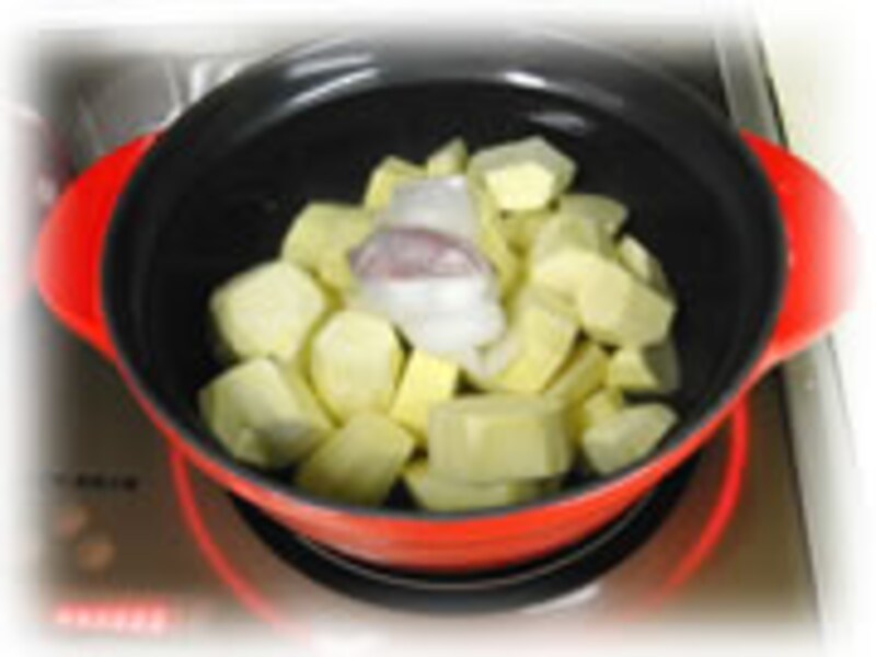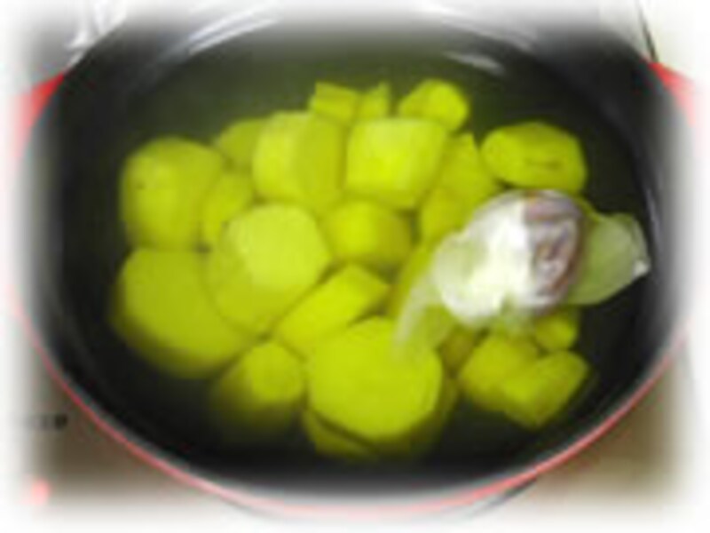 | 1・サツマ芋は綺麗に洗い、皮を厚くむき水にさらしてアクをとります。たっぷりの水でサツマ芋とガーゼに包んだくちなしの実を加えて火にかけます。 | 2・中火で煮てサツマ芋がきれいな色に変わり柔らかく煮上がったら火を止めます。 | |||||||||||||||