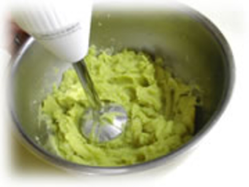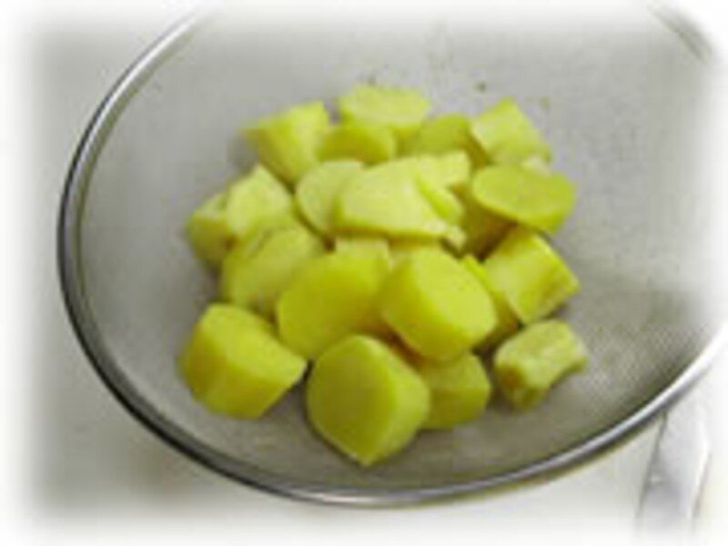 | 3・すぐにザルに上げて、水気を切ります。 | 4・茹で上がった芋は熱いまま裏ごしするか、バーミックスでむらなく潰します。 | |||||||||||||||