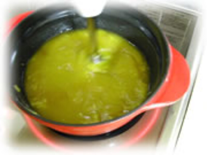 | 5・厚手の鍋にサツマ芋、砂糖、塩、栗の甘露煮シロップを入れ弱火にかけます。 | 6・弱火でじっくりとかき混ぜますが、始めのうちはバーミックスで混ぜ合わせると簡単です。 | |||||||||||||||