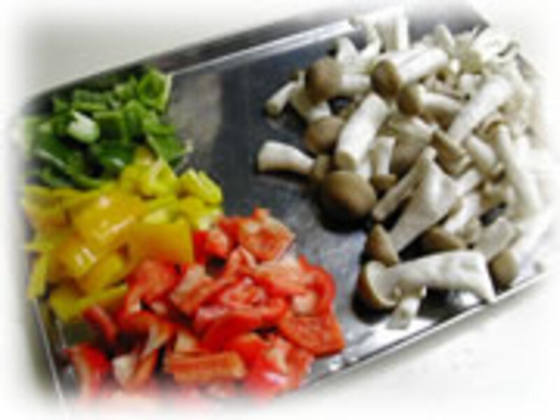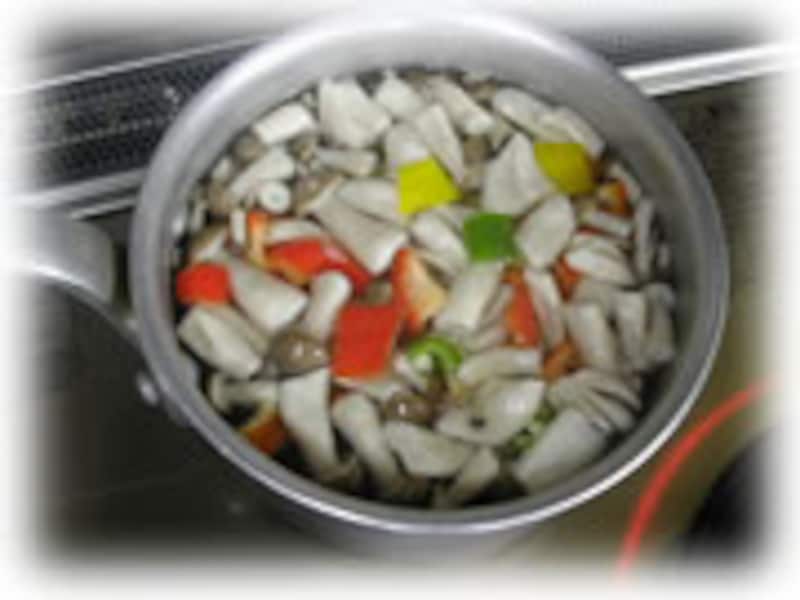 | 1・ピーマン、しめじは食べやすい大きさに切っておきます。 | 2・鍋に水を入れ、沸騰したら野菜をサッと茹でザルに取り出します。 | |||||||||||||||||||||