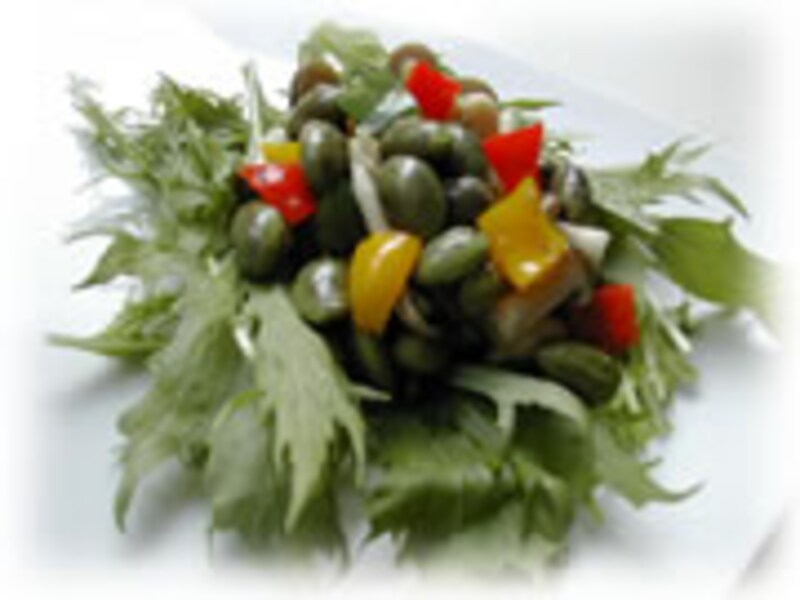 彩り鮮やかなパプリカとお豆のビーンズサラダ。カリッと焼き上がったパンにもピッタリです。ビーンズサラダは材料を茹でてドレッシングで和えてから1時間くらい冷蔵庫におき、充分に味をしみ込ませてから召し上がってくださいね♪ |