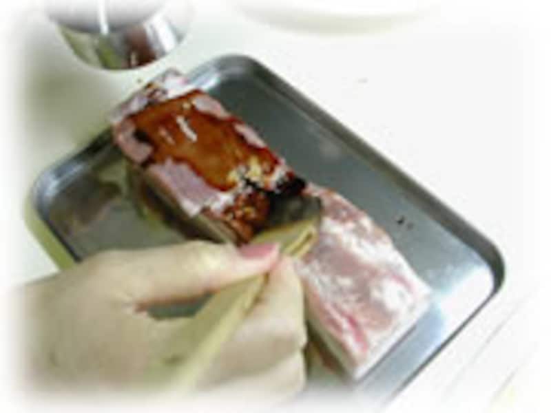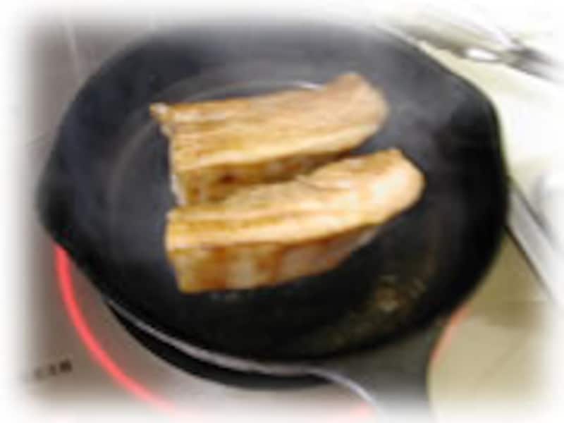 | 1・香ばしさを出すためにバラ肉の表面に濃口醤油(適量)を刷毛で塗っておきます。 | 2・フライパンにサラダ油少々を熱し、肉の表面をまんべんなく焼き色を付け、取り分けておきます。 冷めてから1~2cmの厚さに縦に切っておきます。 |