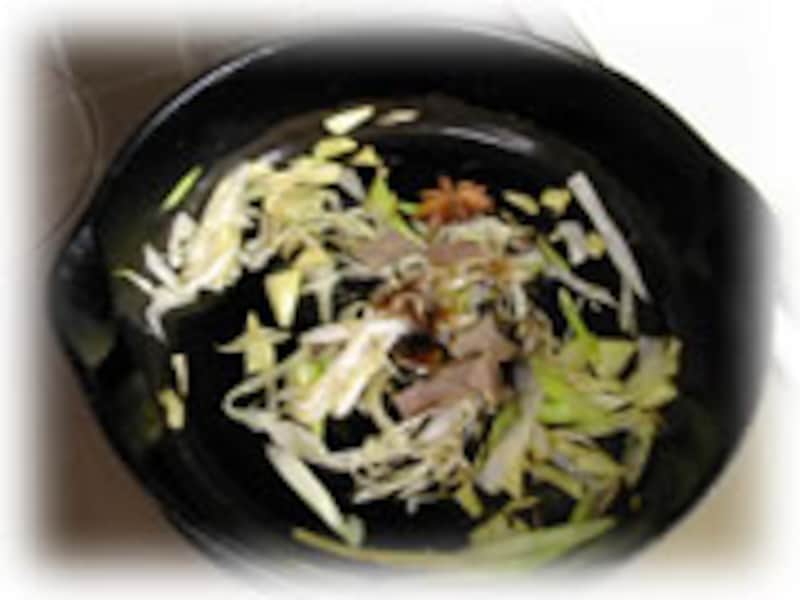 | 7・煮込んだ煮汁はザルで漉して、火にかけ水溶き片栗粉でとろみを付けて煮汁のソースを作ります。 | 8・器に塩ゆでした青菜を敷き蒸した豚肉を並べ、煮汁のソースをかけます。 | |||||||||||||||||||||||||||||||