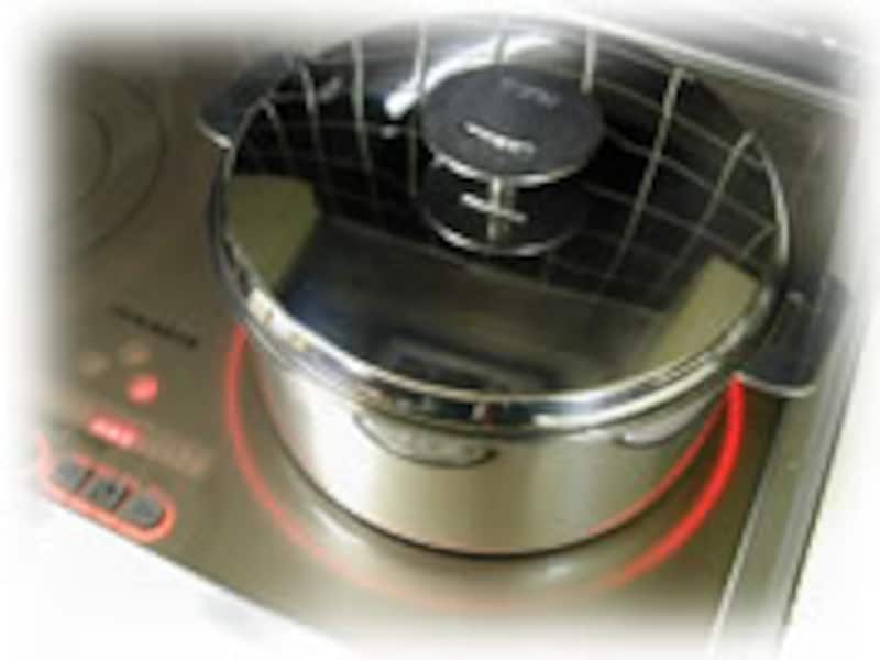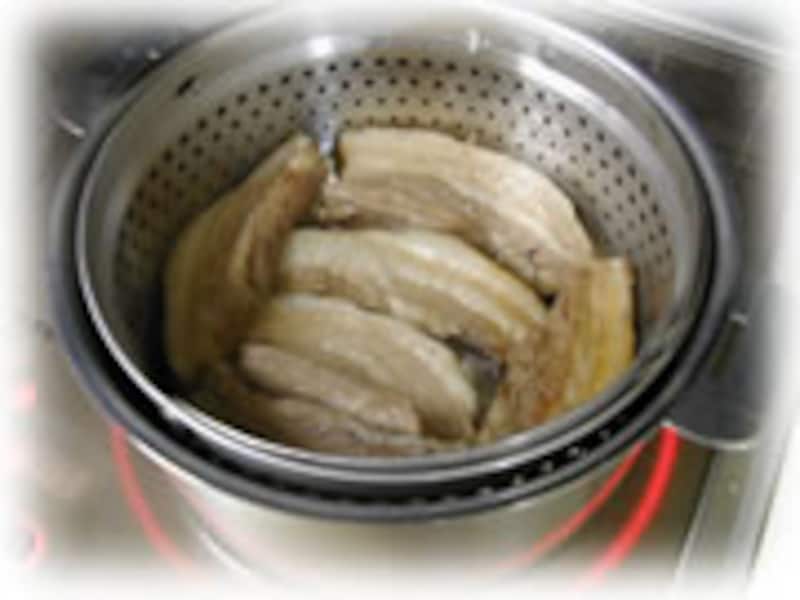 | 5・蒸し器を用意して煮込んでおいた豚肉を入れ火にかけます。 |