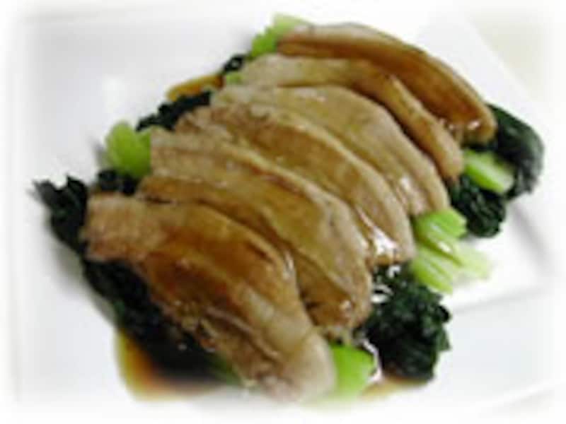 | 7・煮込んだ煮汁はザルで漉して、火にかけ水溶き片栗粉でとろみを付けて煮汁のソースを作ります。 | 8・器に塩ゆでした青菜を敷き蒸した豚肉を並べ、煮汁のソースをかけます。 | |||||||||||||||||||||||||||||||