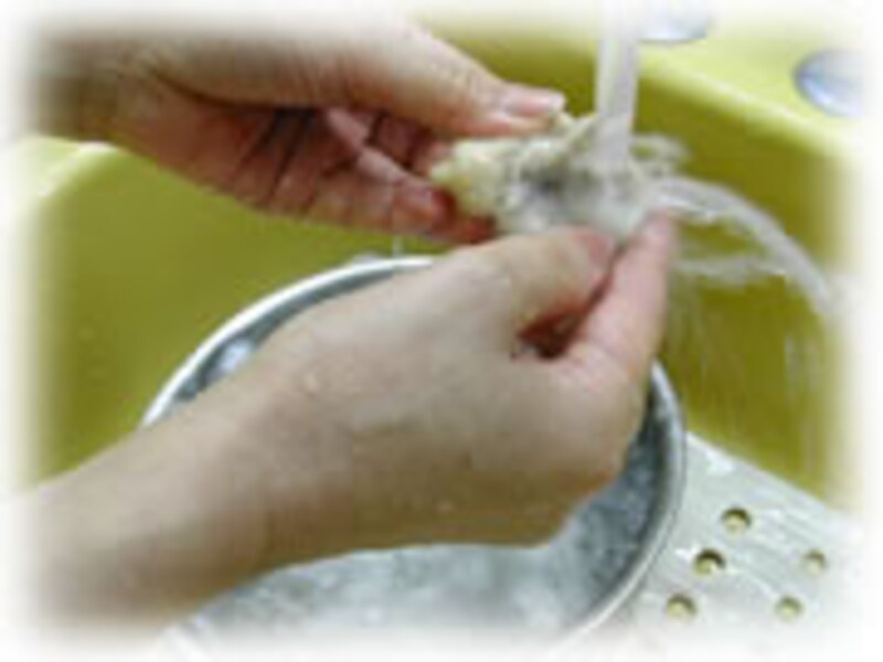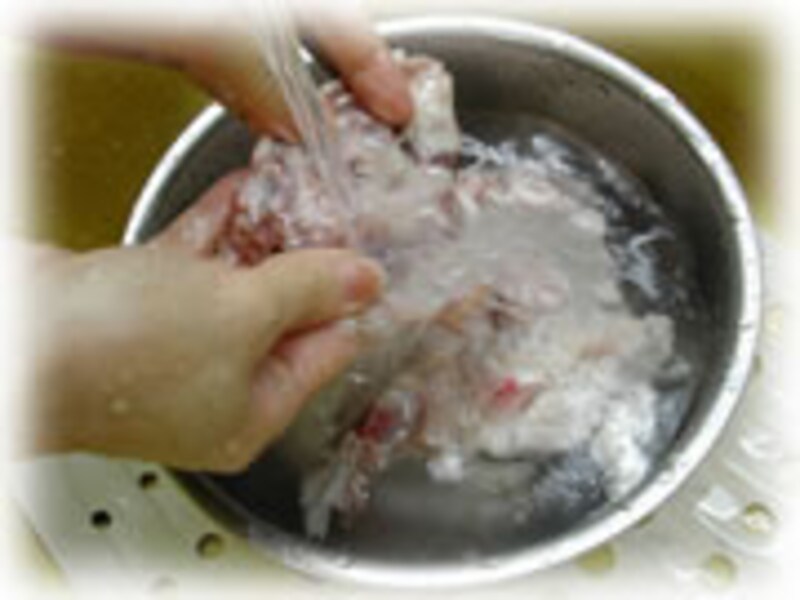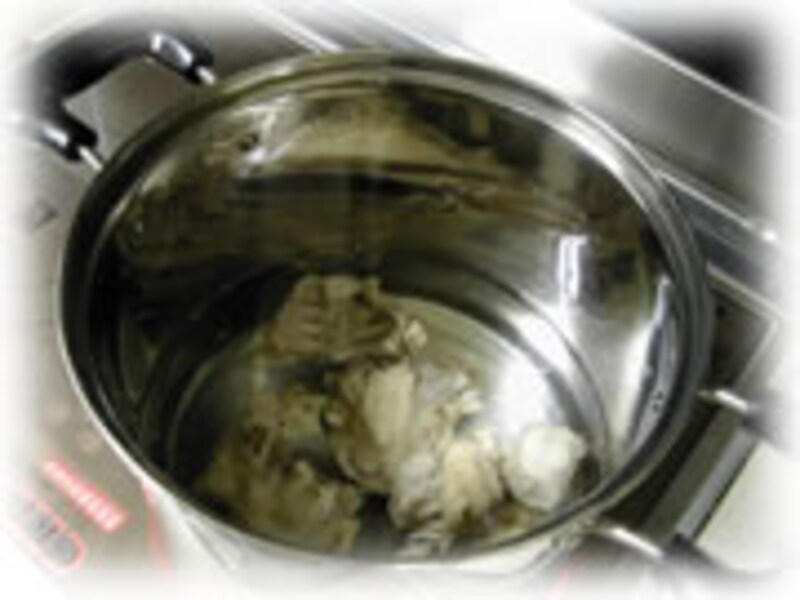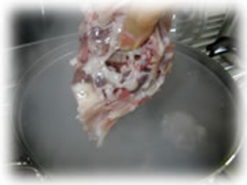 | 3・流水で茹でた鶏ガラを丁寧に水洗いします。 | 4・鍋に水1500ccと、きれいに水洗いをした鶏ガラを入れ、強火にかけ蓋をします。 | |||||||||||||||||
