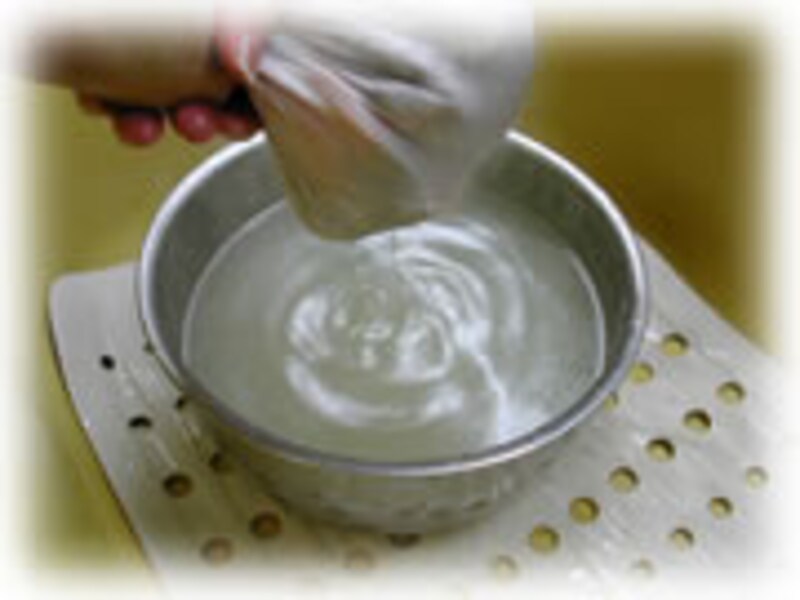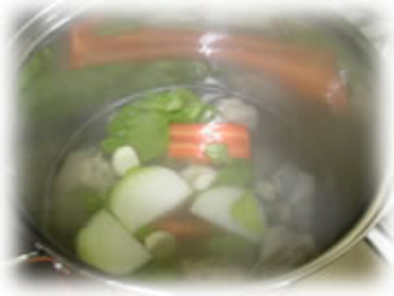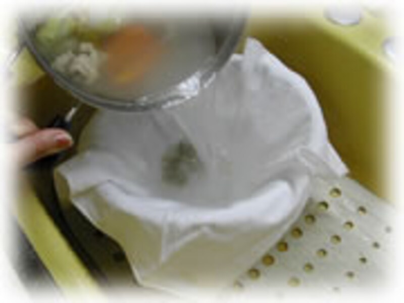 | 5・沸騰したら乱切りした野菜を加え、弱火で2時間程度煮ます。 | 6・熱いままの状態でボウルの上に布巾をおきスープを漉します。 | |||||||||||||||||
