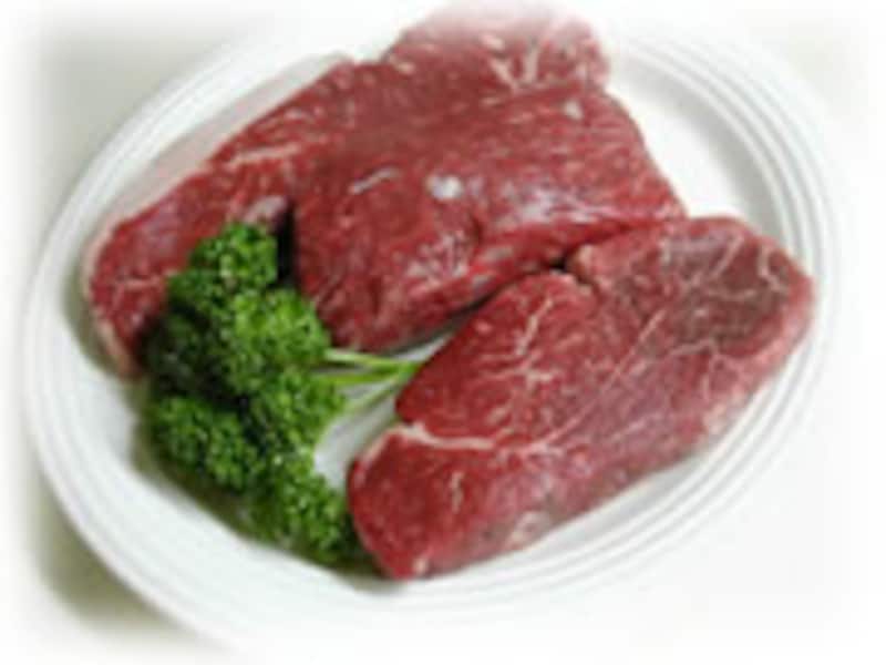| 1・お肉はサーロイン、ランプ、フィレなどからお好みを用意してください。今回はまん中のランプ肉を使いました。 | 2・ランプ肉を5mm厚くらいに切り、軽く塩・コショウを振りかけます。肉の旨味を逃さないよう手早く強火で調理しますから、あらかじめすべての材料は刻んで準備してから始めてください。 | |||||||||||||||||||||||