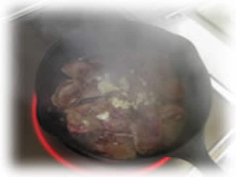 | 3・フライパンを熱してバター大さじ1でマッシュルームを炒め、塩・コショウで味をととのえます。 | 4・フライパンにバターを入れ強火で熱し、肉はステーキを焼くようにサッと焦げ目が付く程度に焼きます。お肉に香りをつけるためブランデーをふりかけ、刻んでおいたニンニクも加えます。 | |||||||||||||||||||||||