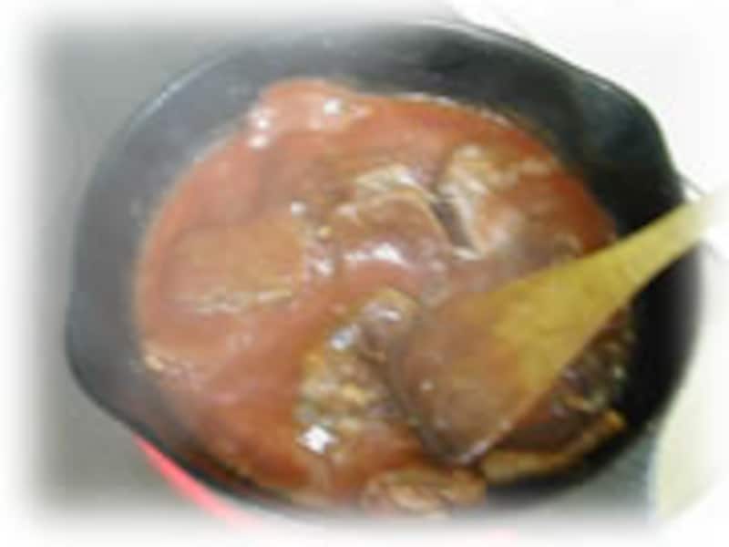 | 5・トマトピューレ、トマトケチャップを加え強火でサッと炒めます。 | 6・次にバターで炒めたておいたマッシュルームを加え、パプリカを振りかけ混ぜ合わせます。最後に生クリームを加えかき混ぜて火を止めます。 マッシュルームを炒め始めてからここまで5分くらいで完了です。お肉の旨味と柔らかさを逃がさないためにもスピードが大切です。 |