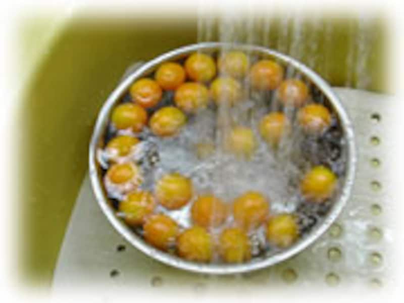 | 1・きんかんは少し赤みかかった新鮮でツヤツヤしたものを選びます。 | 2・流水でよく洗います。 | |||||||||