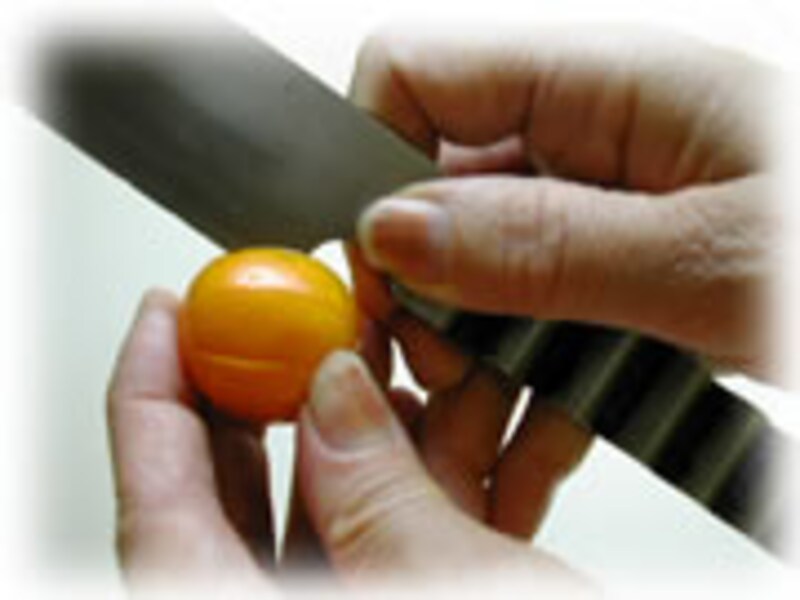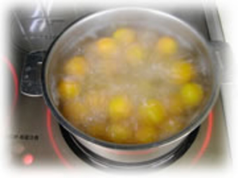 | 3・中の種を取り出しやすくするために、包丁の刃元できんかんのまん中あたりに縦に切り目を6箇所くらいつけます。 | 4・鍋にたっぷりのお湯を沸かし、きんかんを2分ほど茹でたら、お湯ごとザルにあけます。これを2回繰り返してアクを取ります。 | |||||||||