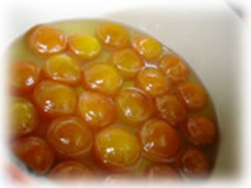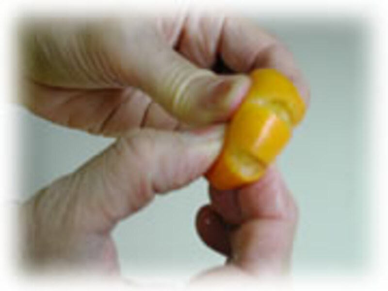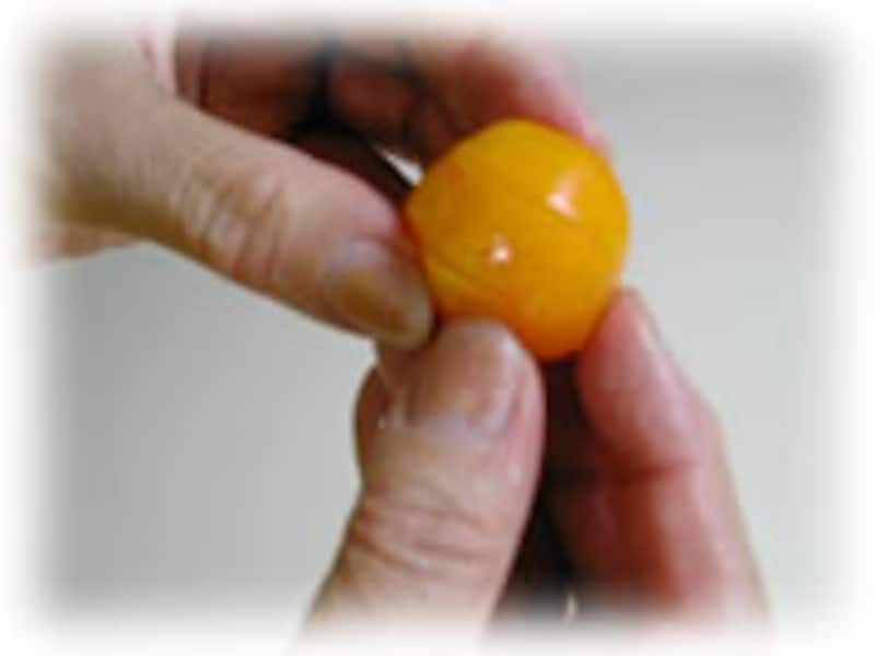 | 5・きんかんが冷めたら指で押し、中の種を丁寧に取ります。竹串などを使うと取り出しやすいです。 | 6・種を取ったらきんかんを元通りの形に戻しておきます。 | |||||||||